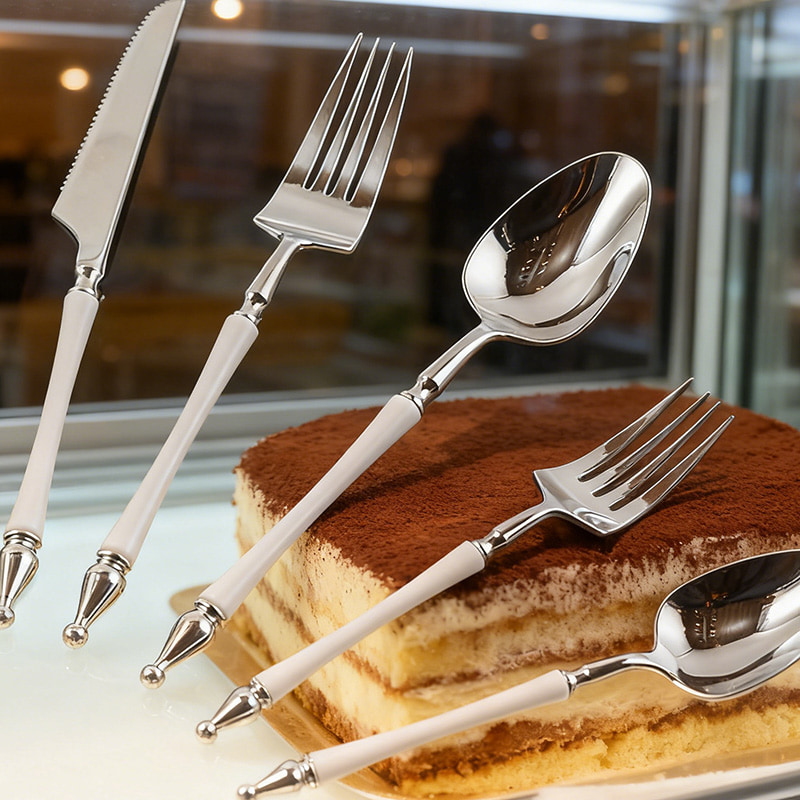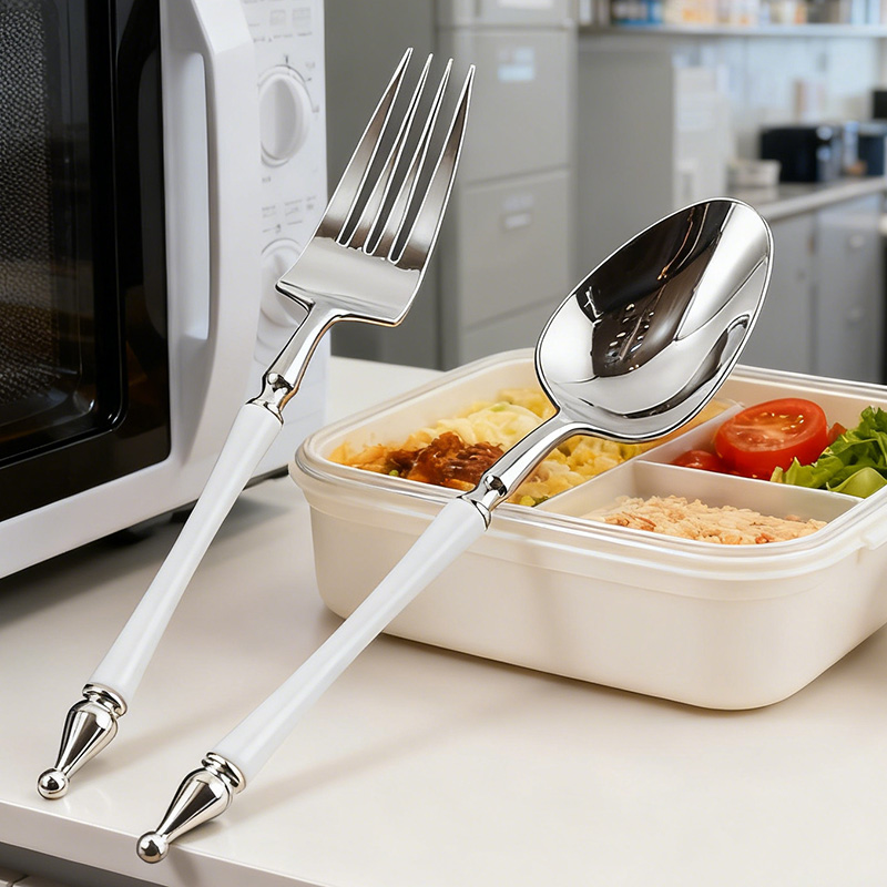 Silver Plastic Knife Fork Spoon Set with White Handle: Elegant disposable cutlery with clean modern contrast