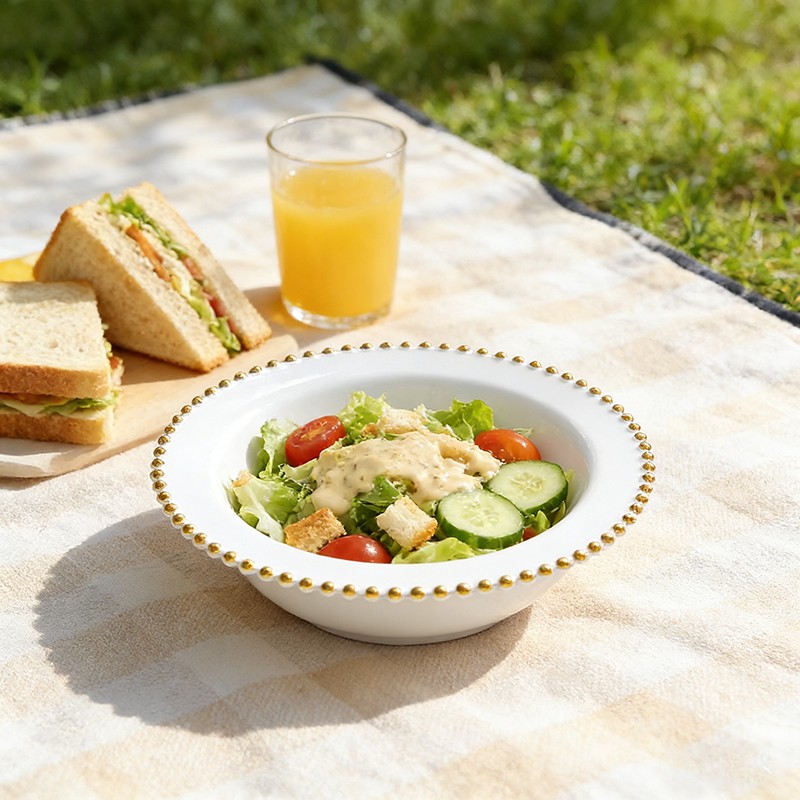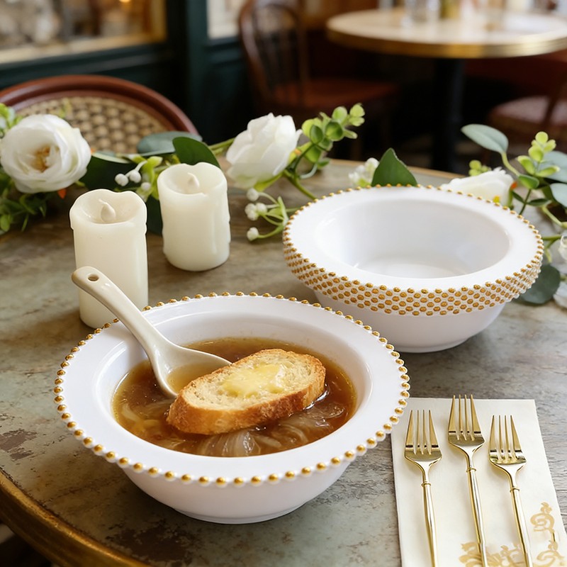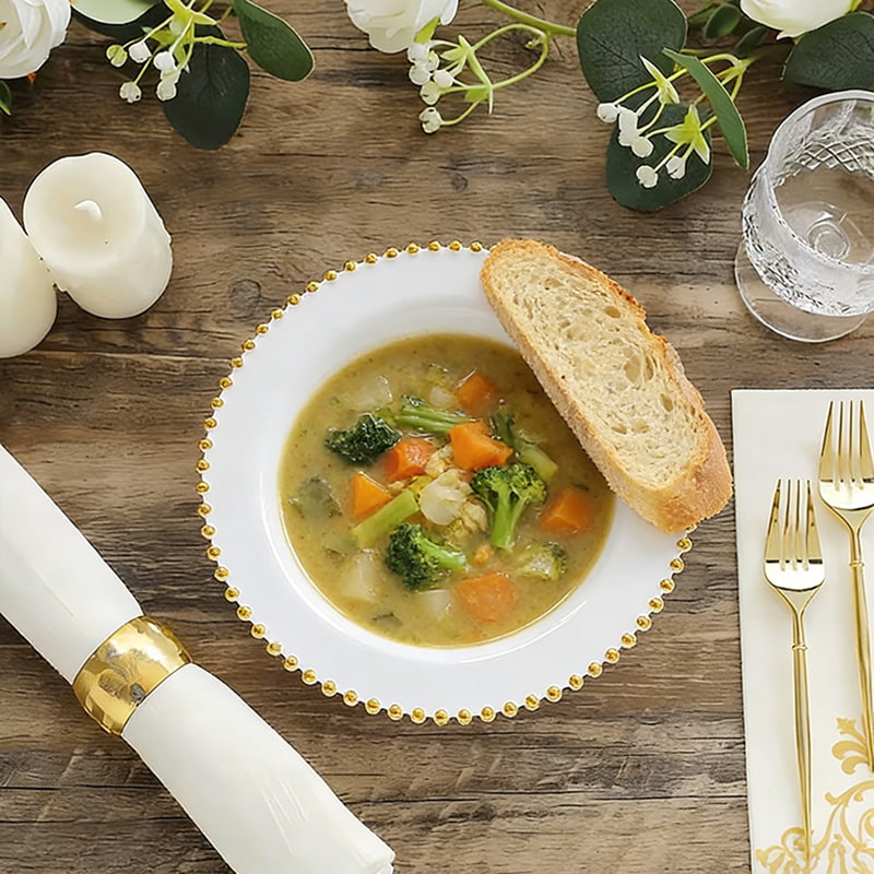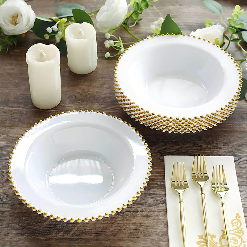 White Disposable Plastic Bowls with Gold Pearl Beaded Rim: Elegant event tableware with premium decorative detail