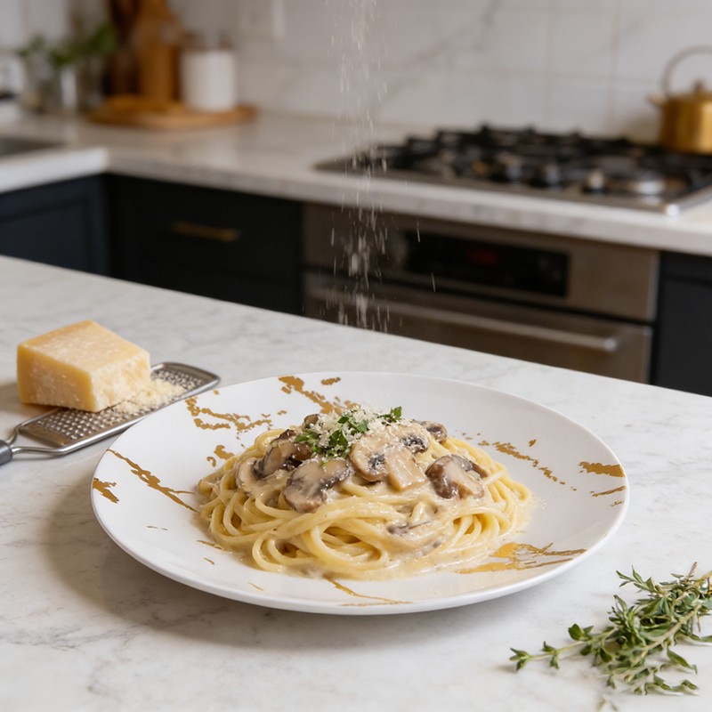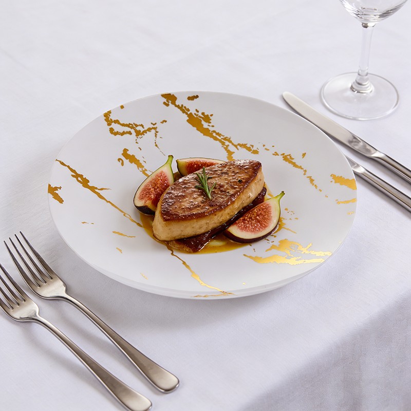 Refined White and Gold Design: Stylish aesthetic enhances food presentation
