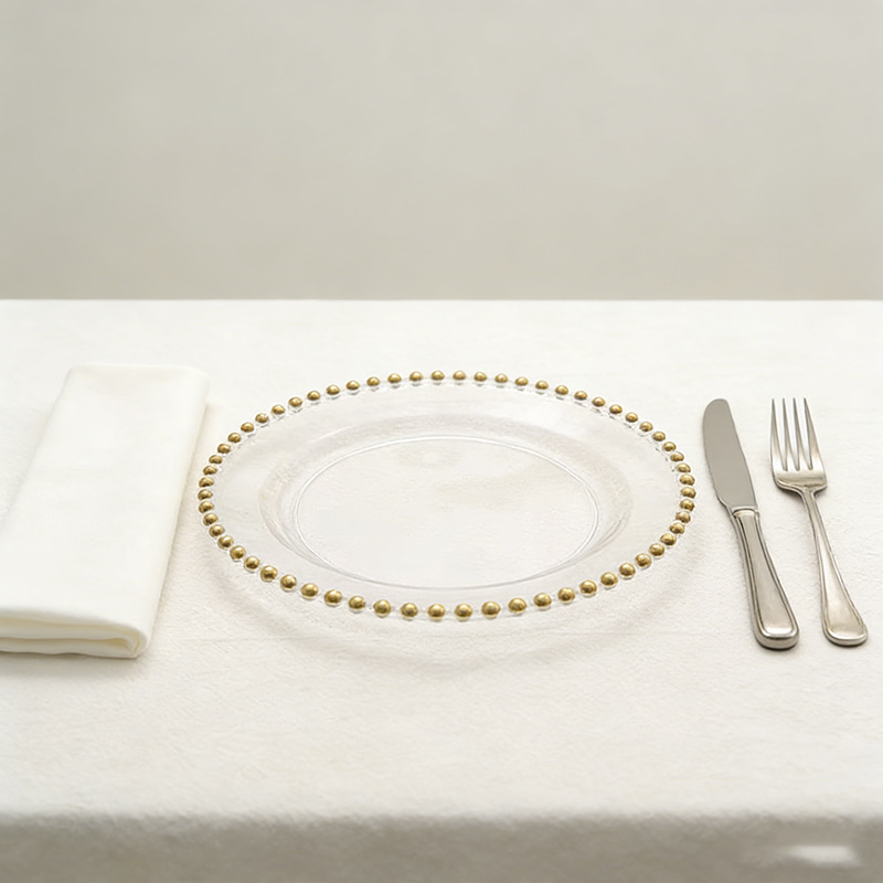 Clear Plastic Plate with Gold Pearl Beaded Rim: Elegant and stylish disposable tableware with premium detail