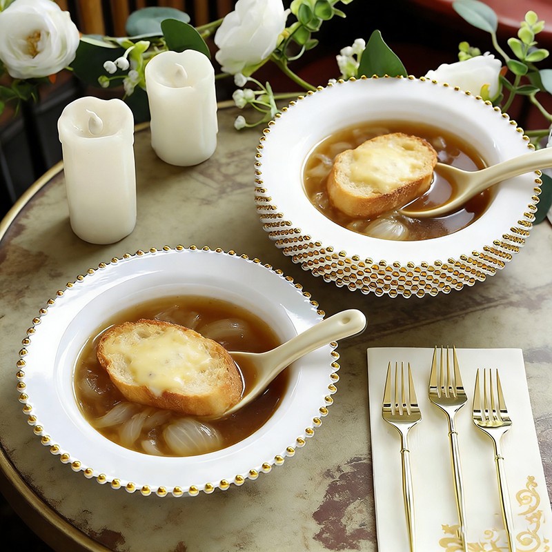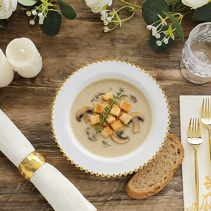White Disposable Plastic Bowls with Gold Pearl Beaded Rim: Elegant event tableware with premium decorative detail