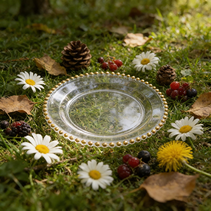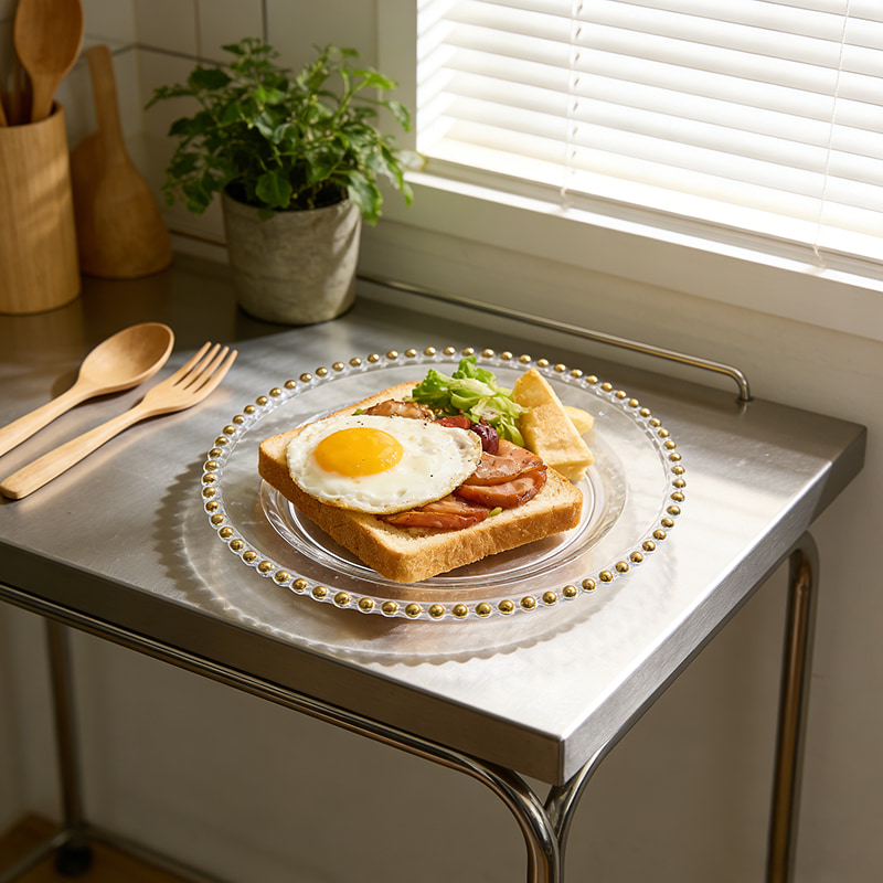 Clear Plastic Plate with Gold Pearl Beaded Rim: Elegant and stylish disposable tableware with premium detail